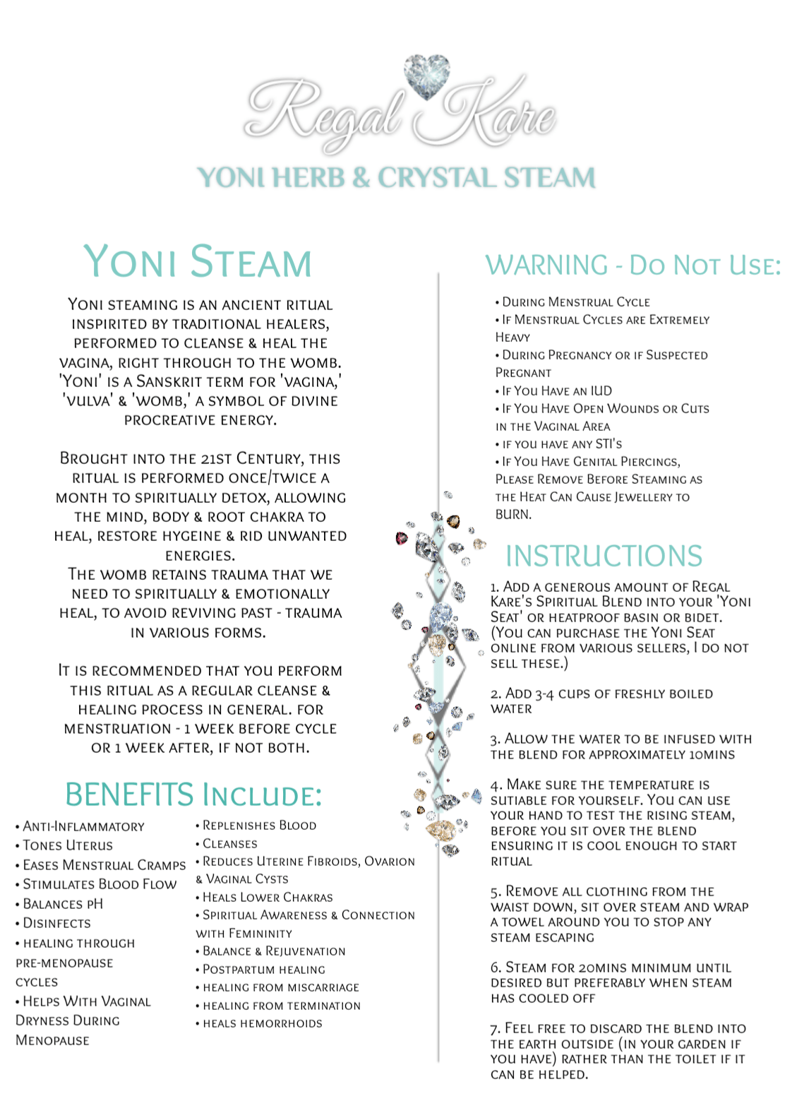 Πολλές γυναίκες υποφέρουν από σοβαρές κράμπες της εμμήνου ρύσεως, βαριά ροή αίματος, χαμένες περιόδους, ακανόνιστες περιόδους και κολπική ξηρότητα μαζί με ανισορροπία Ph. Αυτό μπορεί να συμβεί για διάφορους λόγους, όπως διατροφή, εμμηνόπαυση, άγχος και πολλές άλλες επιπλοκές στη μήτρα ή στην περιοχή των γεννητικών οργάνων. Μαζί με αυτά τα ζητήματα, η μήτρα πρέπει να υποστεί τόσο πολύ τραύμα που μπορεί να μείνει μαζί μας πνευματικά, όπως οι προηγούμενοι σεξουαλικοί σύντροφοι, αποβολές κ.λπ. Το Yoni στον ατμό επιτρέπει στις γυναίκες να καθαρίσουν, να απολυμάνουν και να επανασυνδεθούν με τον θηλυκό εαυτό, επιβαρύνοντας τη μήτρα του αρνητικού και ανεπιθύμητες ενέργειες. Η Regal Kare έχει δημιουργήσει ένα «Yoni Steam Herbs & Crystal Cleanse». Αυτό είναι ένα παραδοσιακό τελετουργικό για τον εσωτερικό εαυτό που μπορεί να εκτελεστεί 1-2 φορές το μήνα ως ρουτίνα αυτοεξυπηρέτησης. Αυτό το τελετουργικό προορίζεται για ΟΛΟΥΣ τους θεραπευτικούς σκοπούς, συμπεριλαμβανομένου του καθαρισμού, της απολύμανσης και της αποκατάστασης. Αυτό το μείγμα αποτελείται από αποξηραμένα βότανα και κρυστάλλινα τσιπ, τα οποία έχουν καθαριστεί με αγάπη και φροντίδα Sage (Smudging), για να παρέχουν τις καλύτερες θεραπευτικές ιδιότητες κατά τον ατμό.